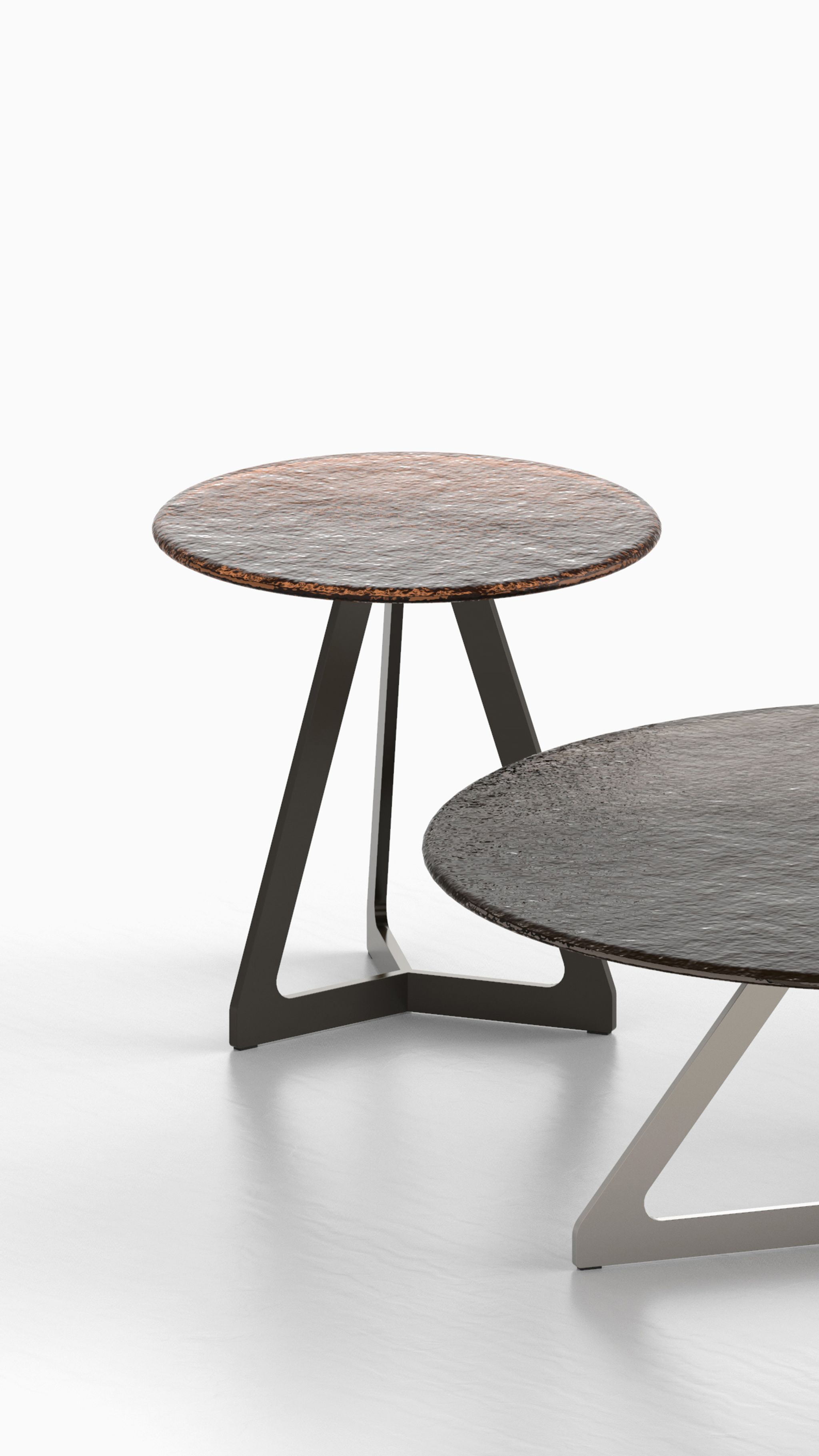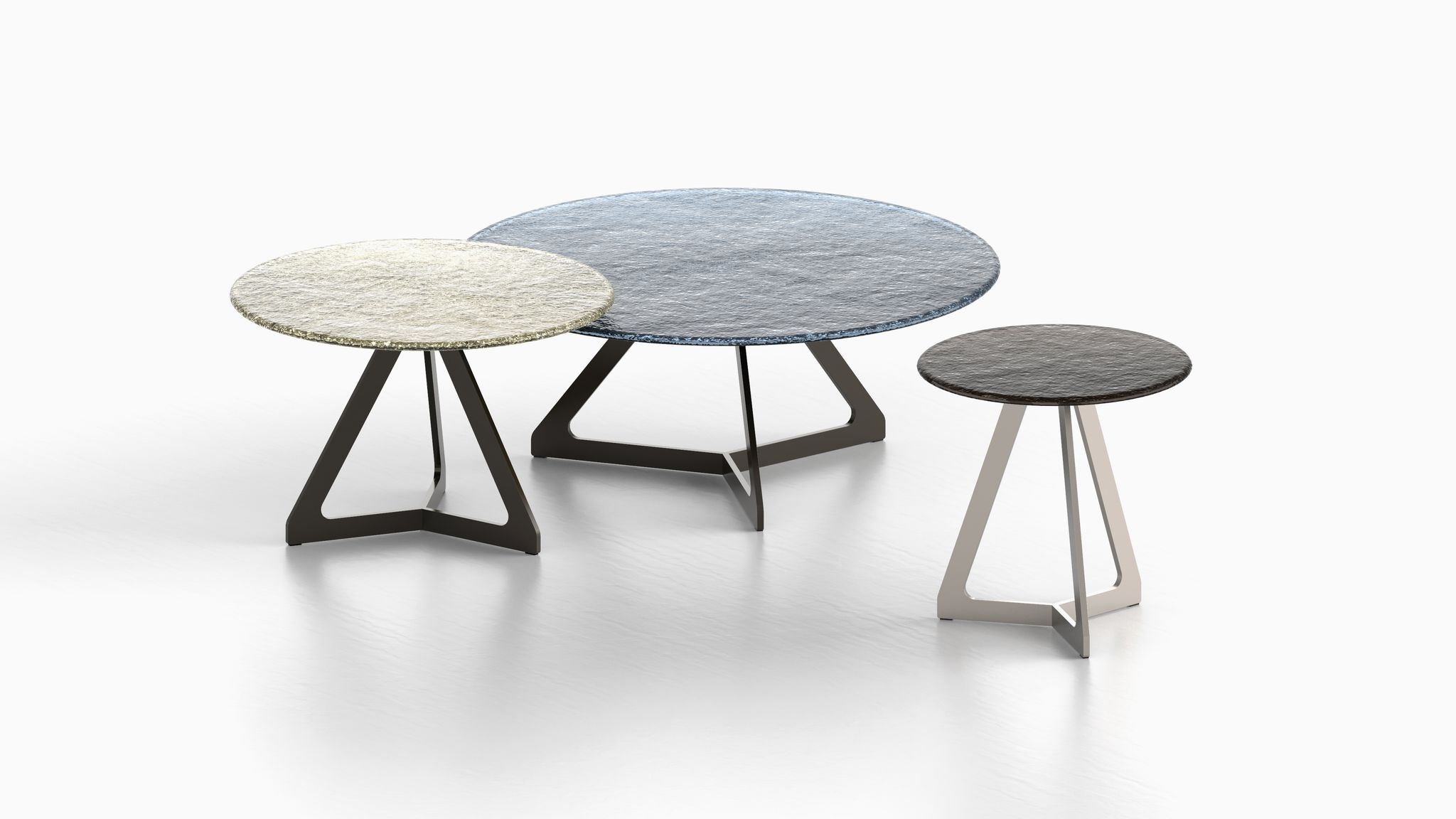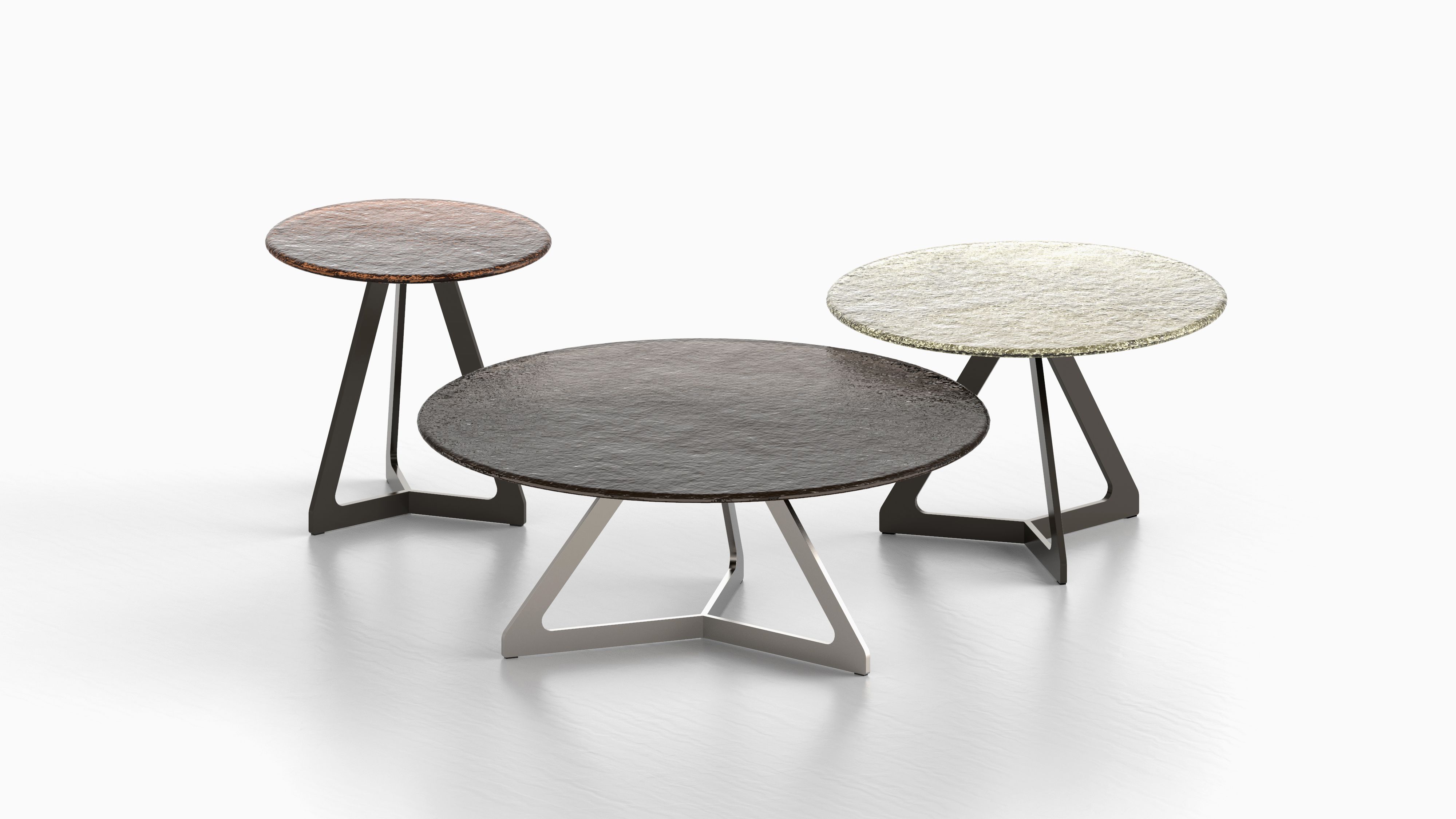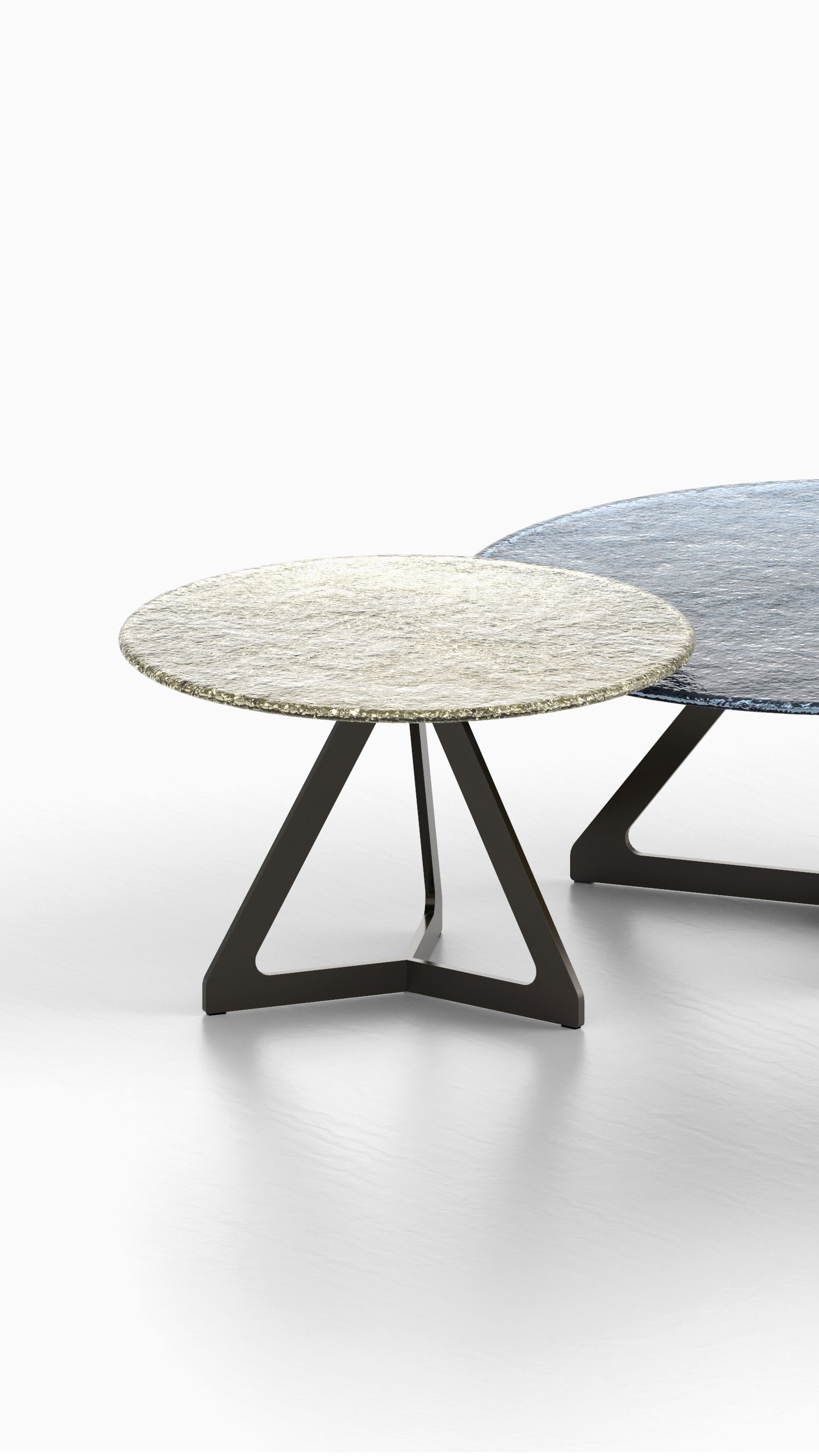 Il vetro fuso diviene protagonista della collezione Lakes, una serie di coffee-table e side-table dove il materiale viene trattato quasi fosse allo stato liquido, in un’alternarsi di riflessi e trasparenze esaltate dallo spessore e dai bordi raggiati.