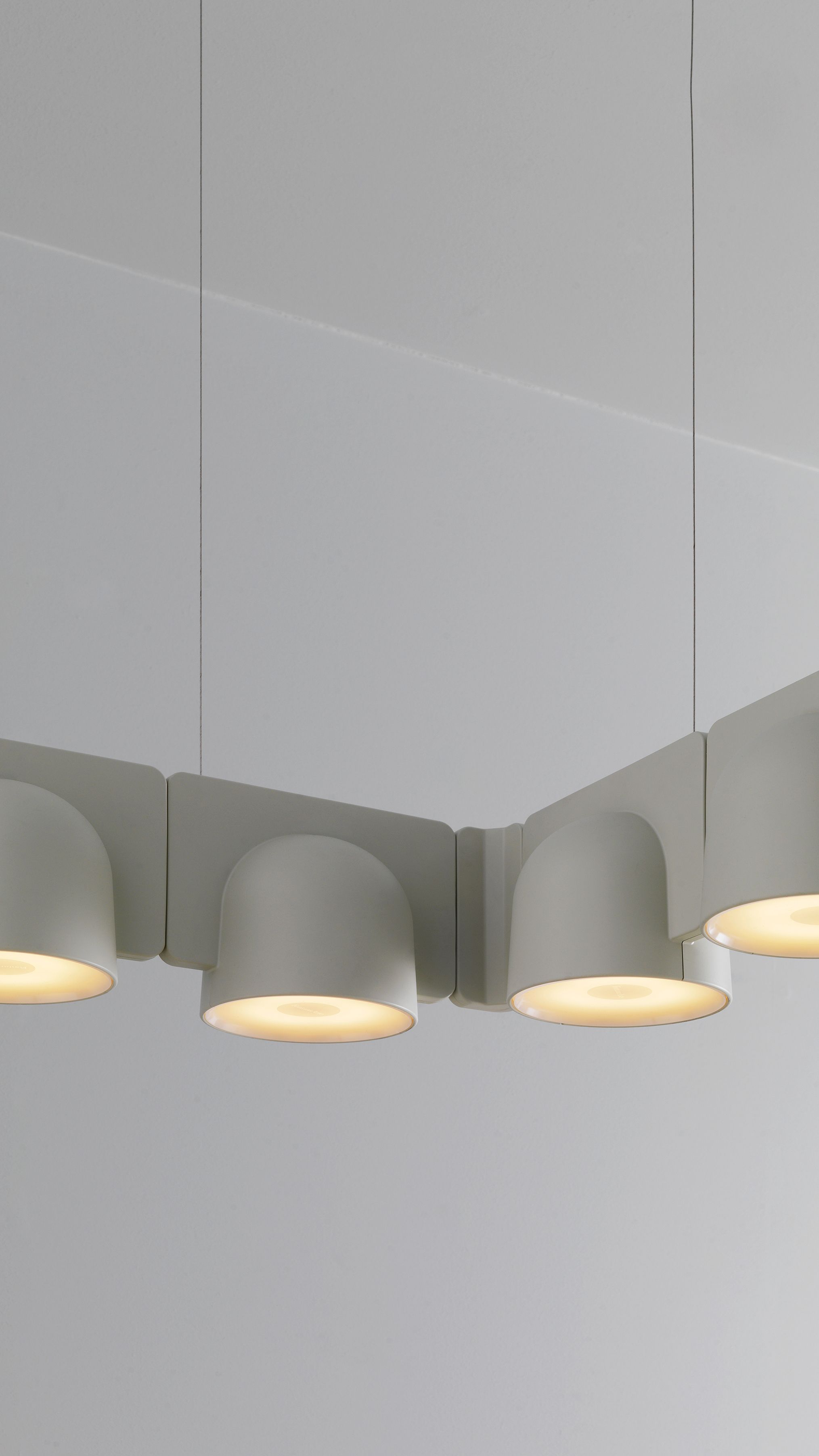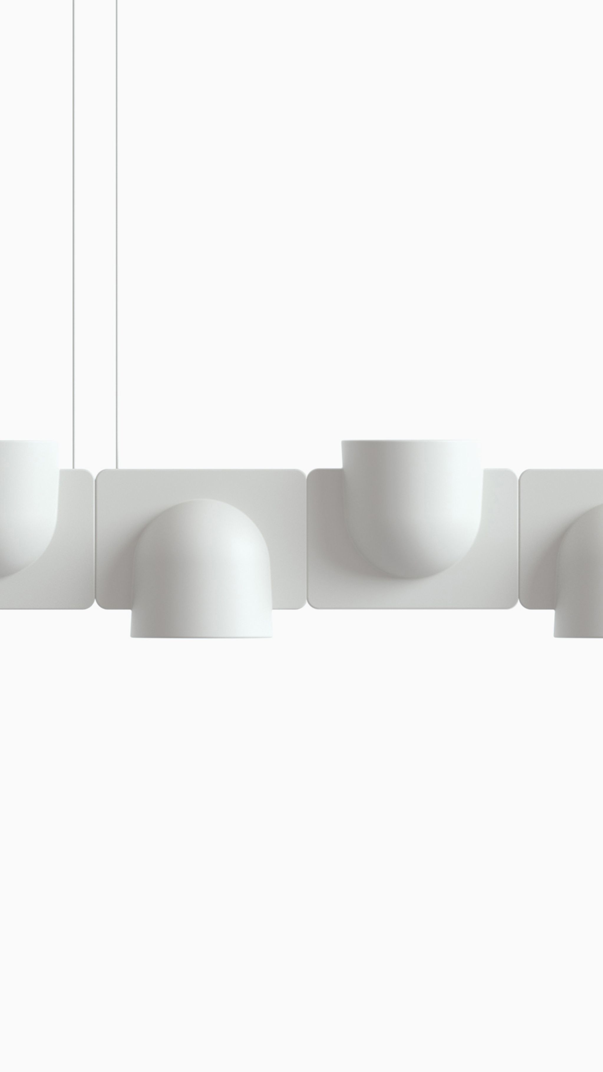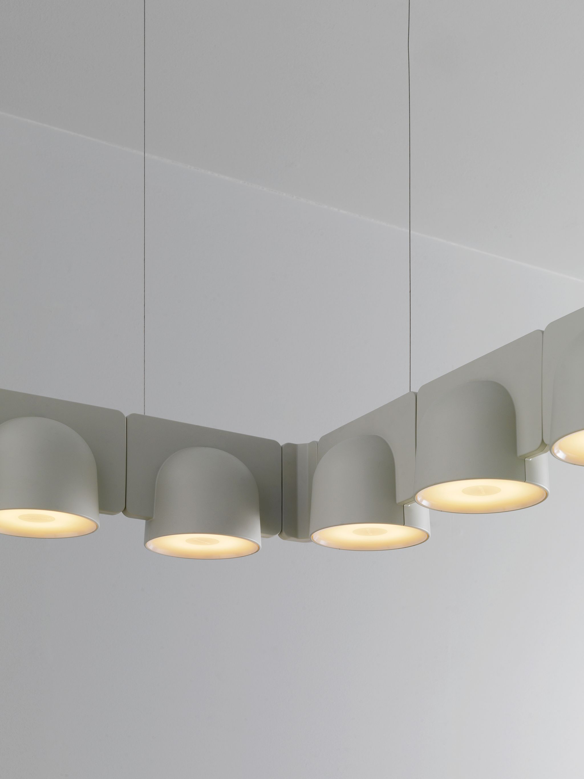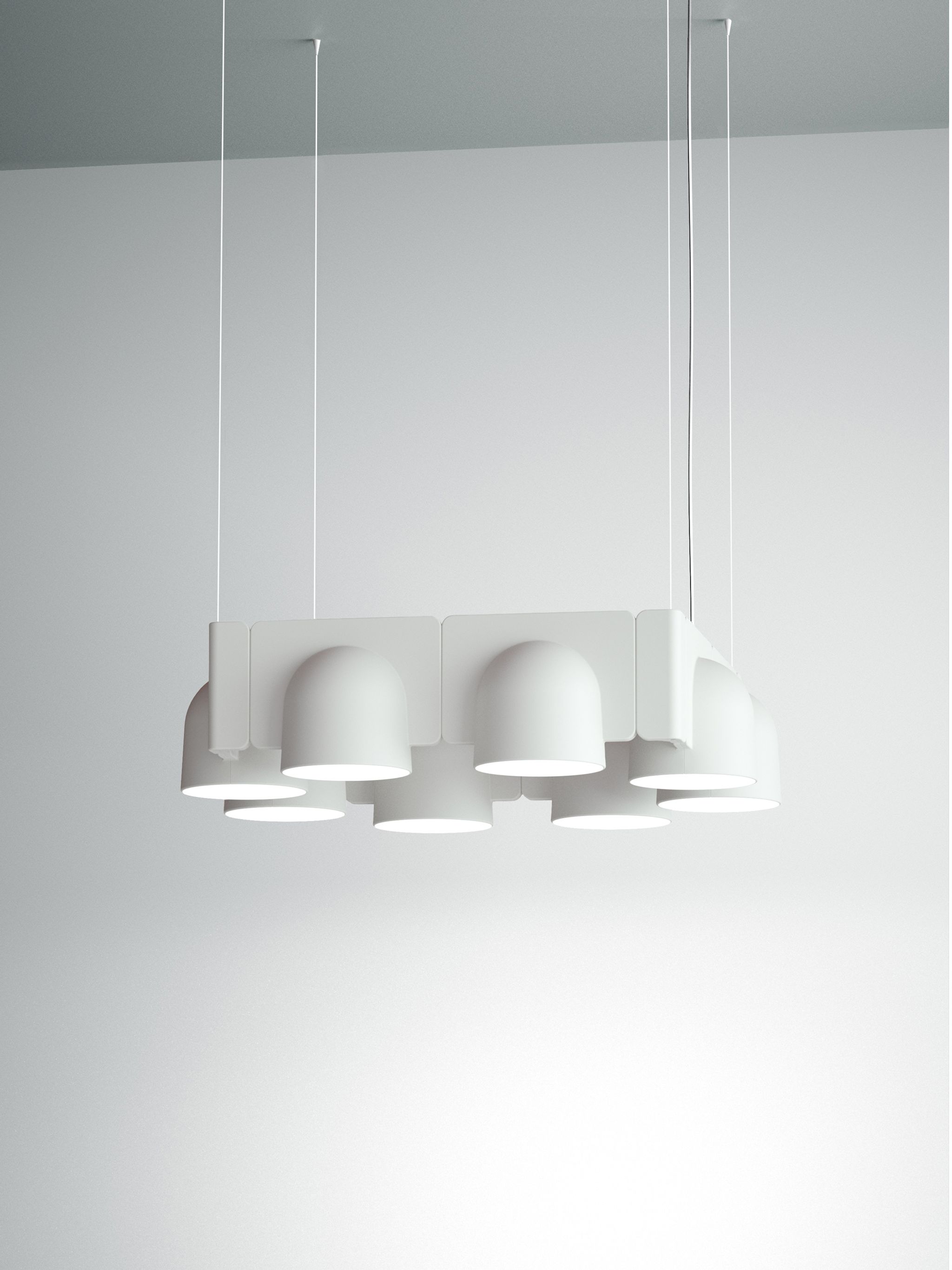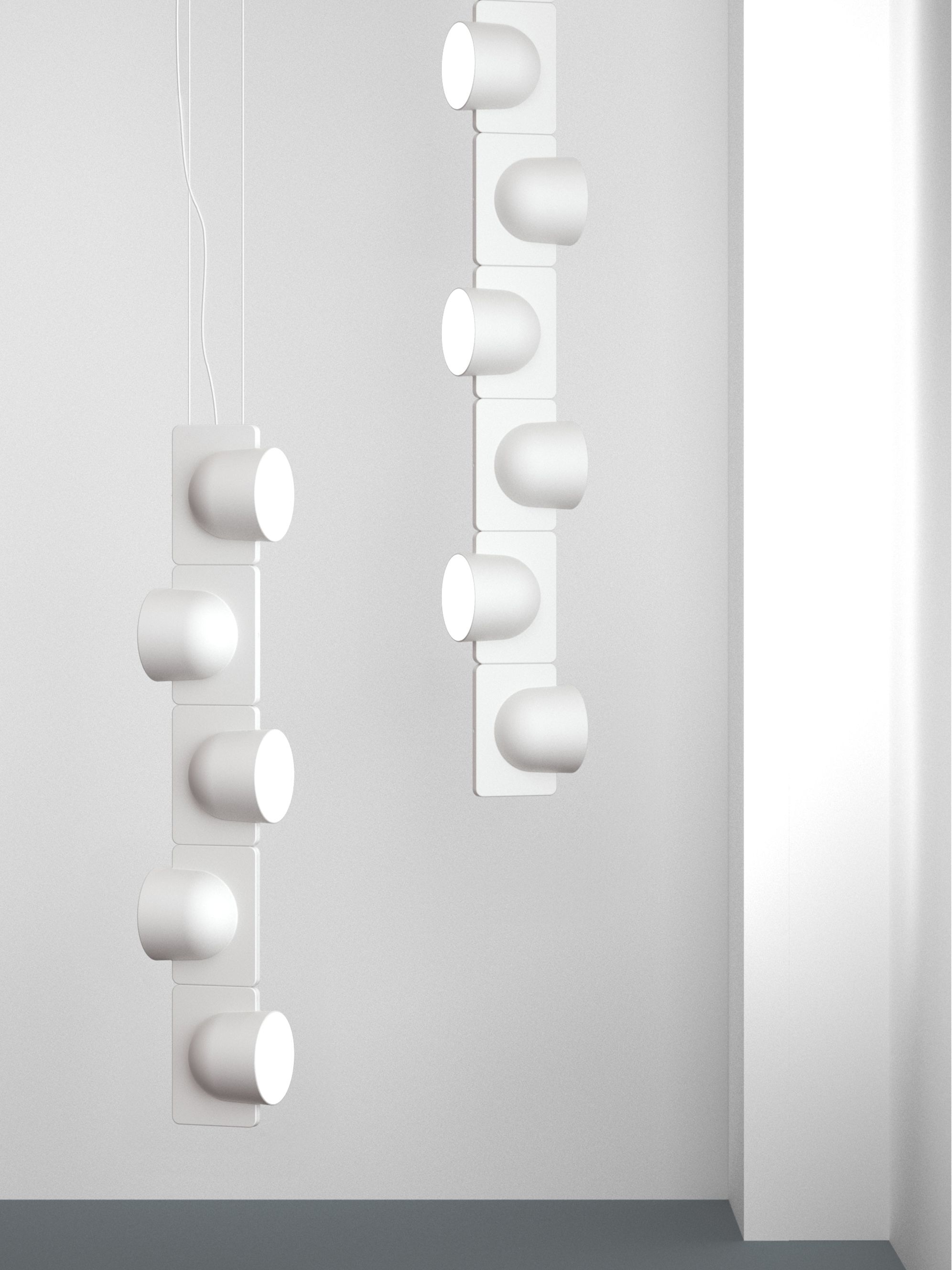 Igloo is a self-supporting lighting system that, thanks to a series of electromechanical connections with curves and spacers, allows for consecutive linking of up to one hundred units without the need for any additional power cable. The double shell in self-extinguishing plastic technopolymer allows for easy installation of the units, whether vertically or horizontally, uplighting or downlighting. The system uses LEDs as the light source and is suitable for contract installation in the retail, hospitality, office and business sectors or in homes.