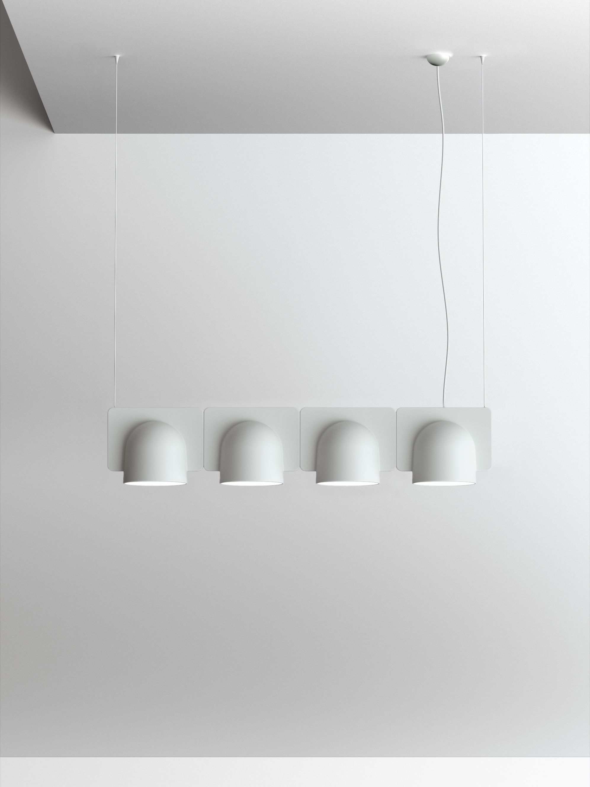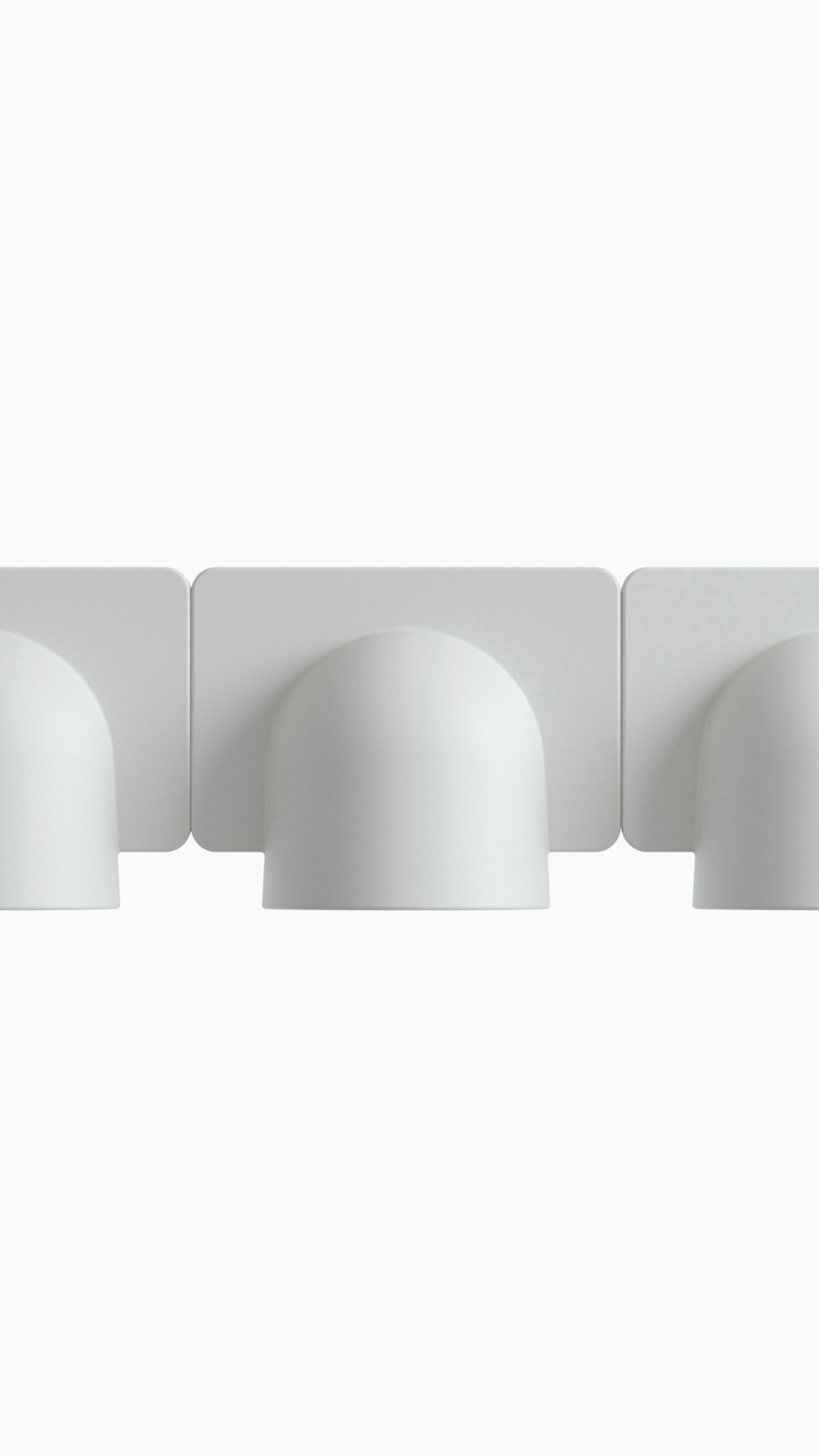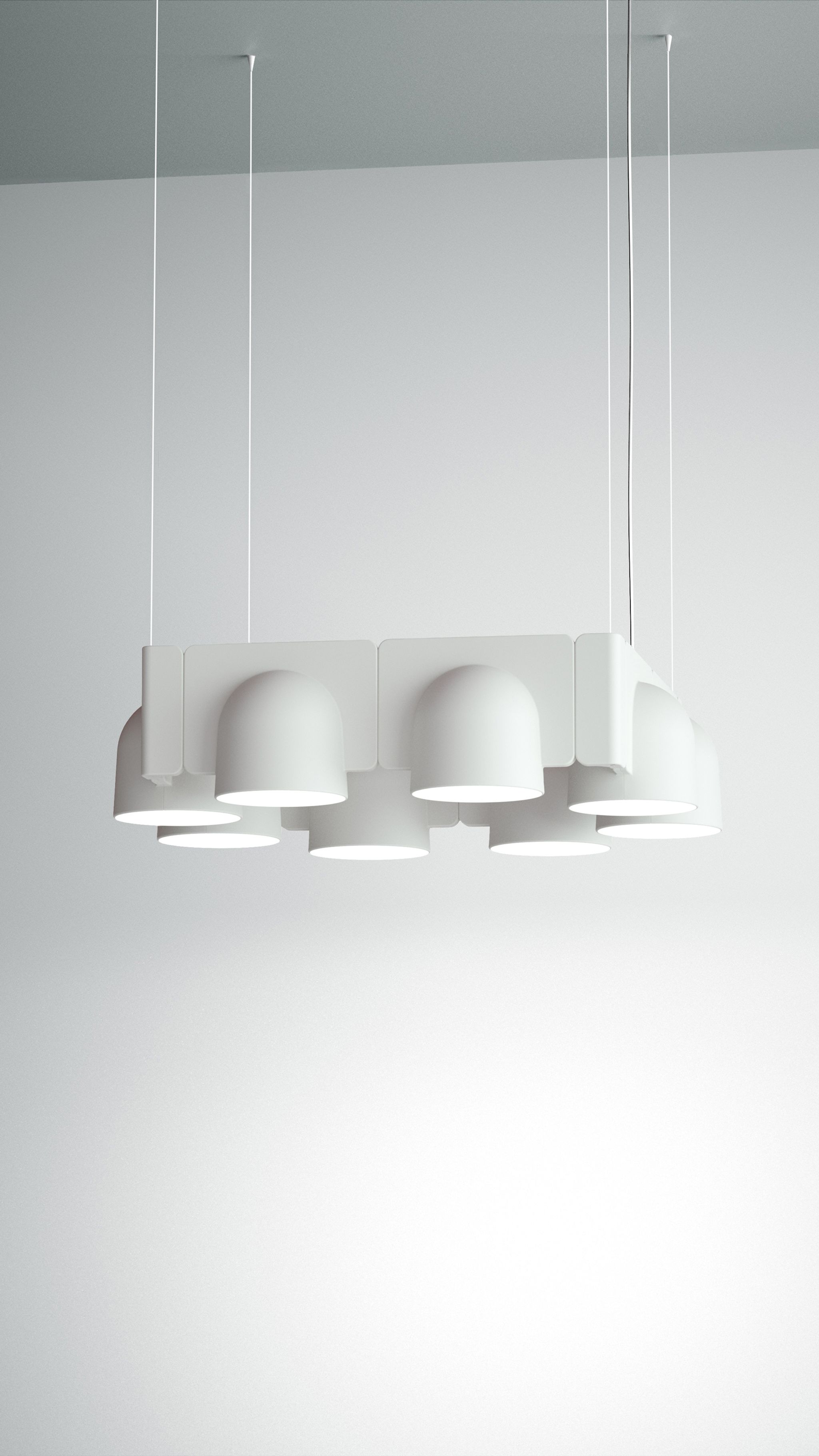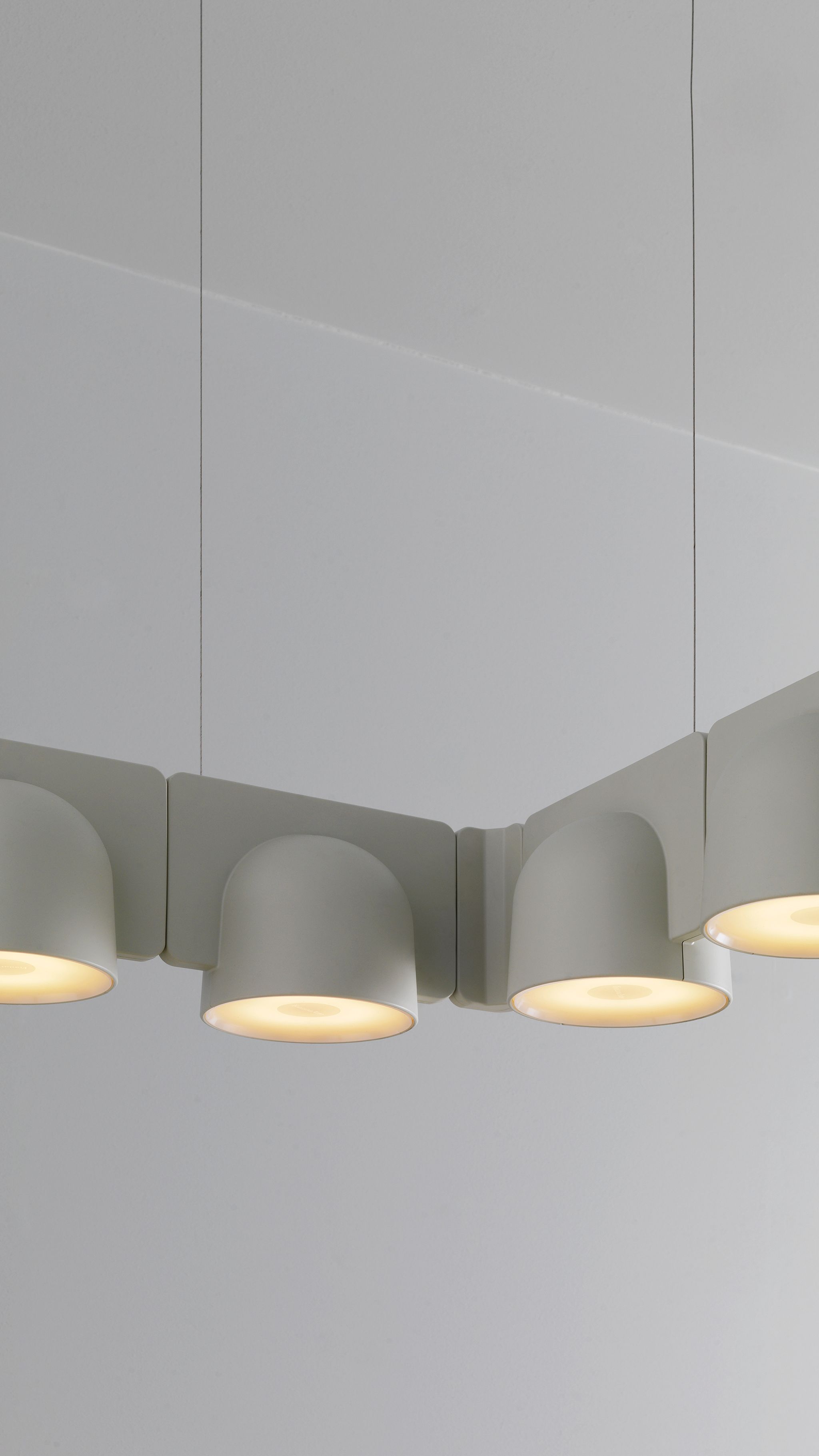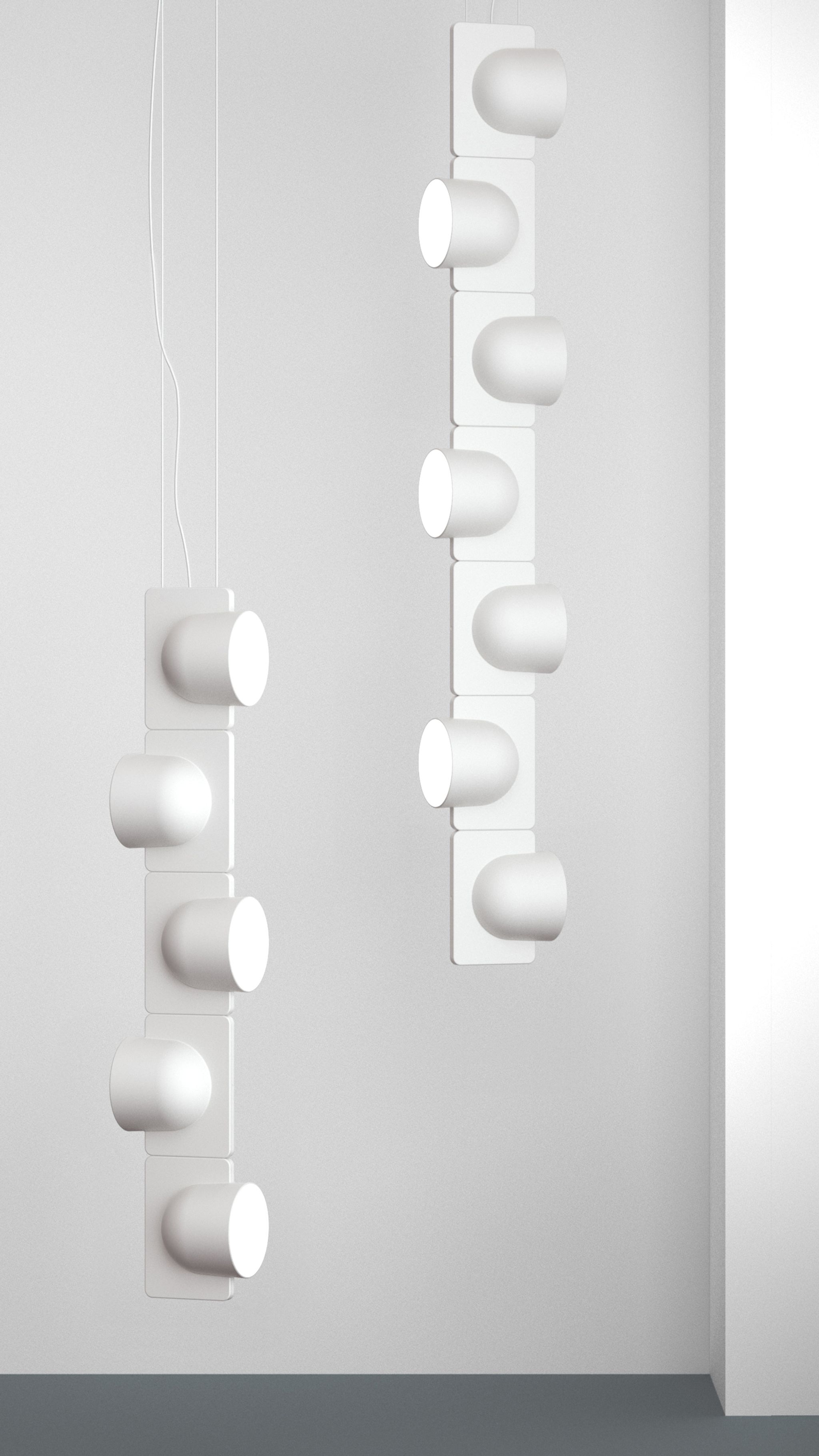 Igloo is a self-supporting lighting system that, thanks to a series of electromechanical connections with curves and spacers, allows for consecutive linking of up to one hundred units without the need for any additional power cable. The double shell in self-extinguishing plastic technopolymer allows for easy installation of the units, whether vertically or horizontally, uplighting or downlighting. The system uses LEDs as the light source and is suitable for contract installation in the retail, hospitality, office and business sectors or in homes.