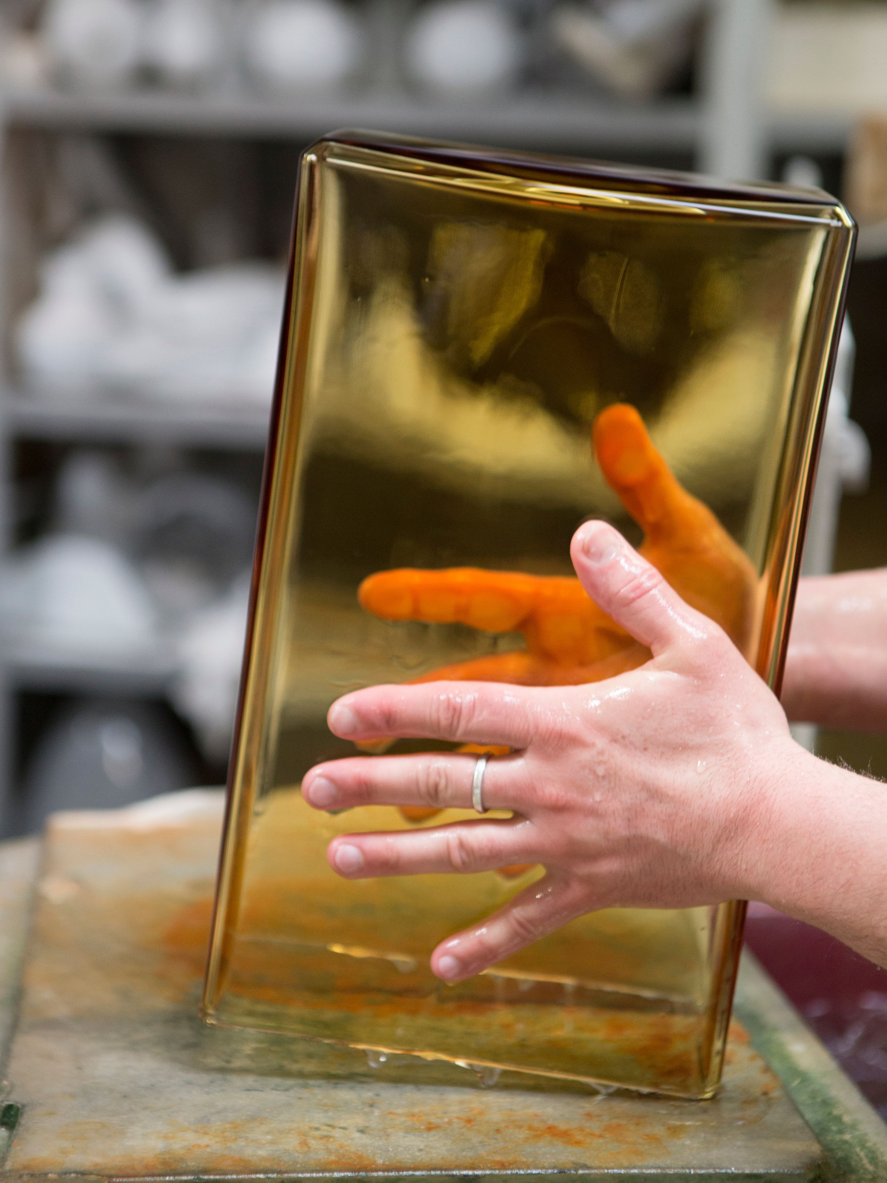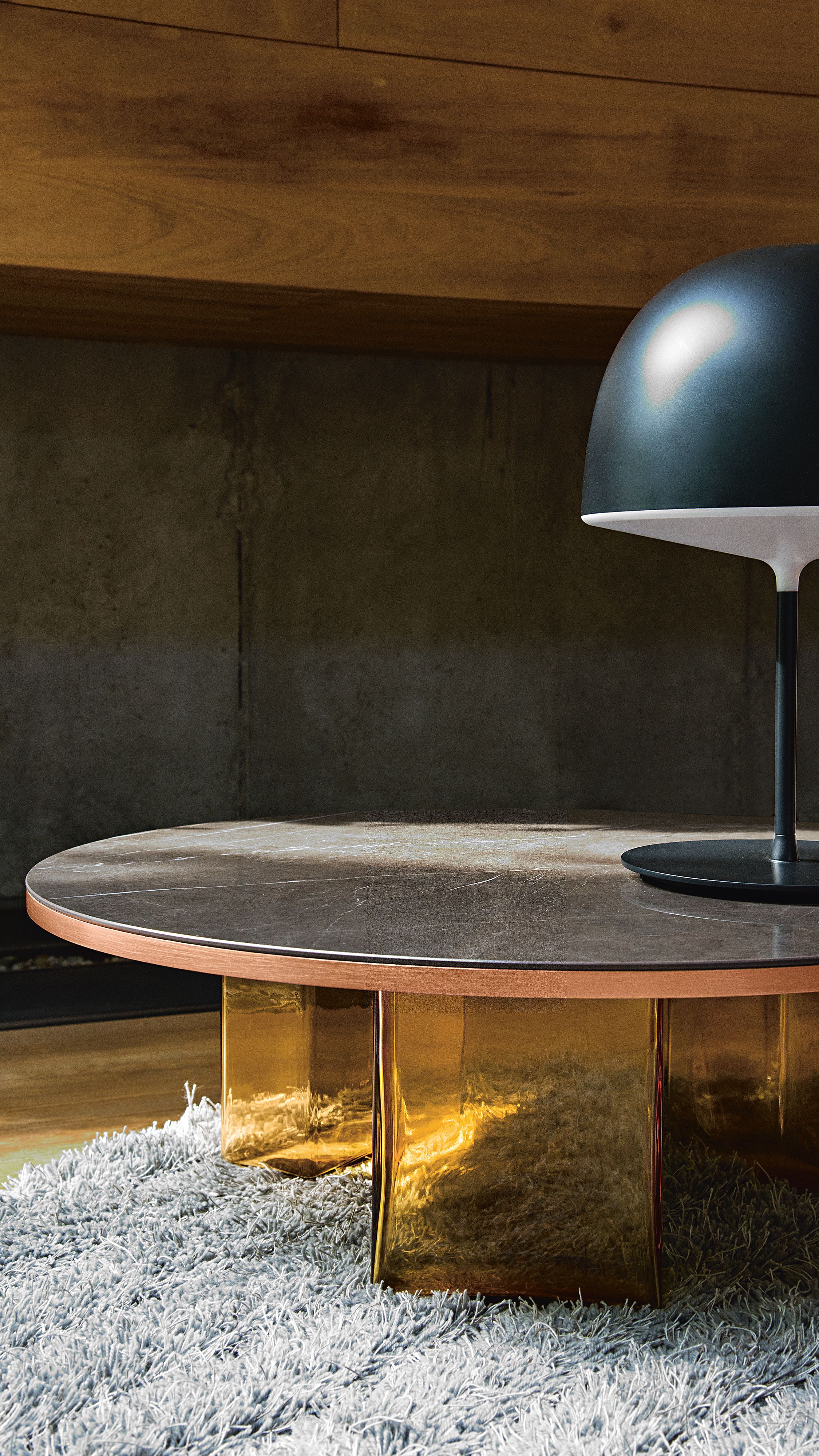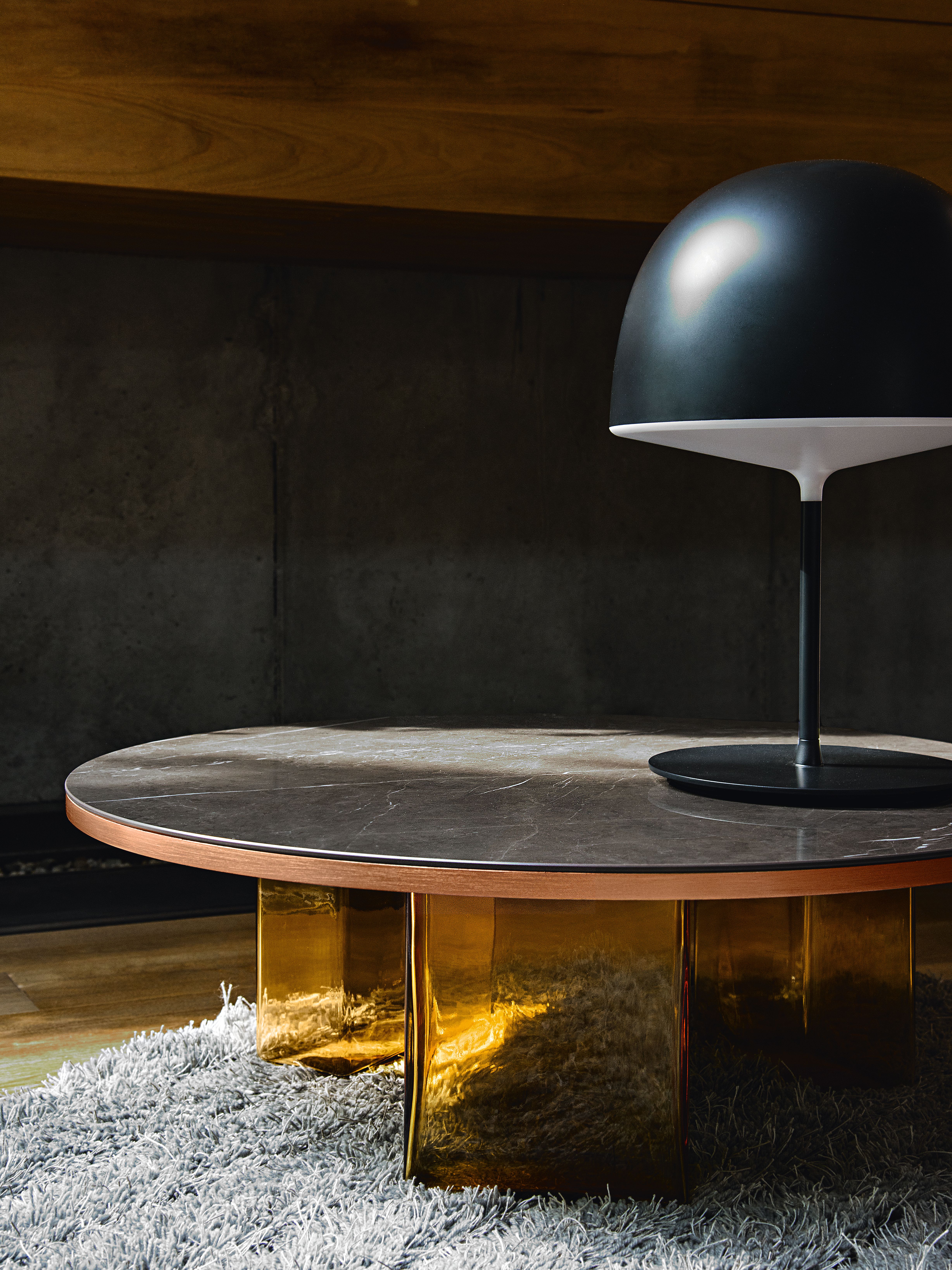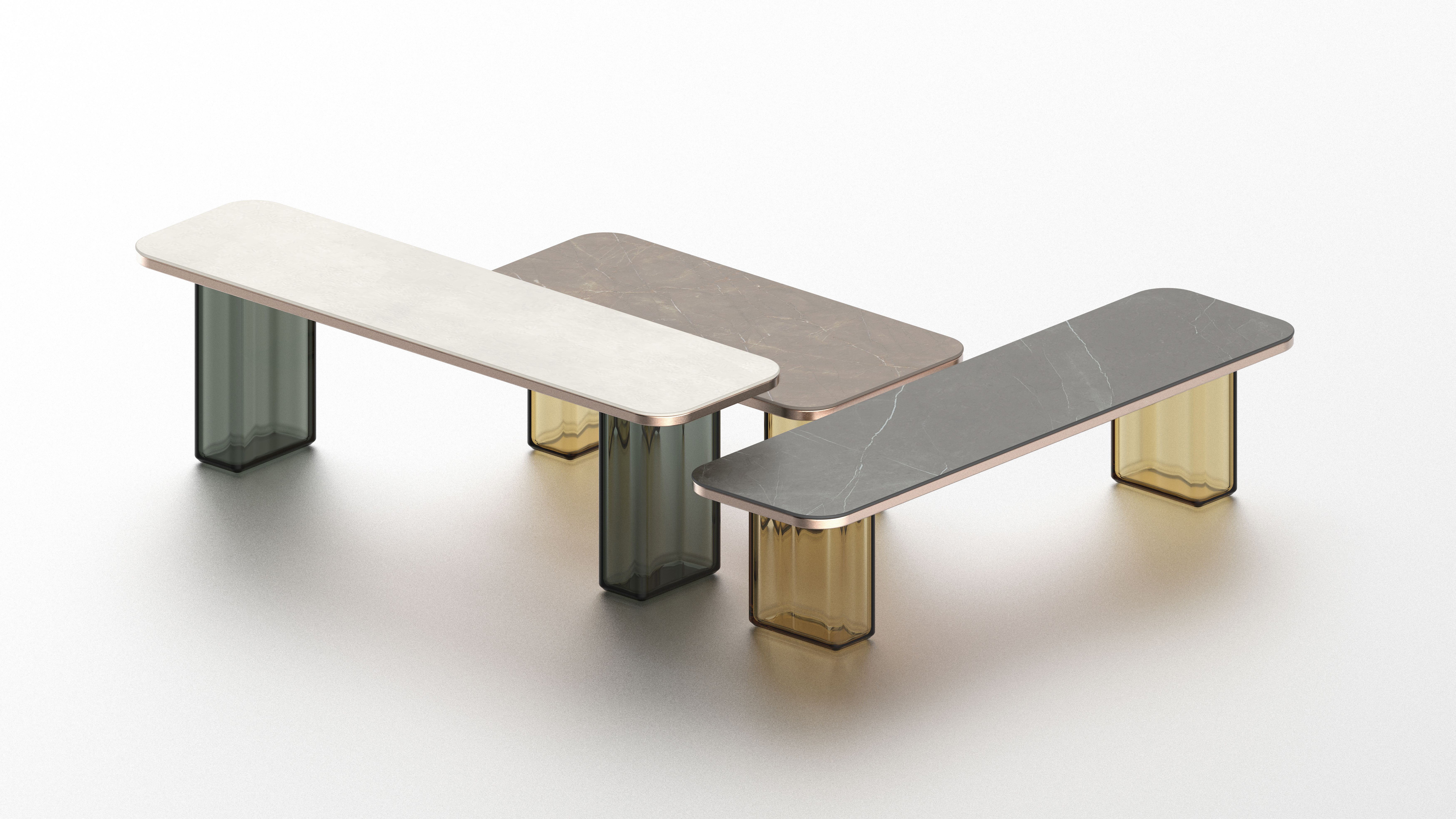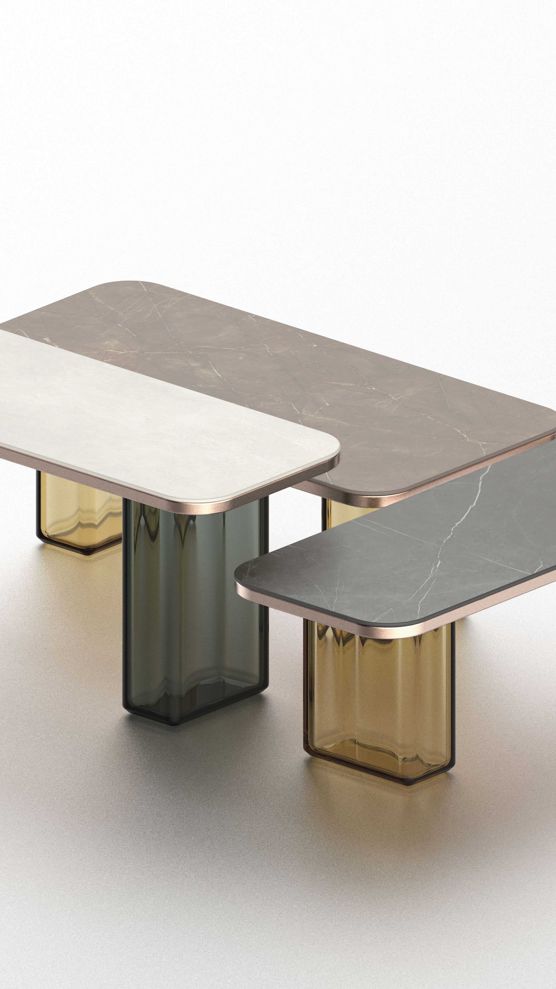 Lands is a collection of coffee-tables inspired by the aerial views of rural lands, characterized by different shapes and colors depending on the type of cultivation. The features of the ground, seemingly random, generate attractive color and formal compositions to which refers the Lands collection, consisting of tables with different shapes and heights designed both for single use or to be combined. Lands are composed of two or three bases in hand-blown glass and tops made in back-painted frosted glass or stones, joint together by a metal edging.