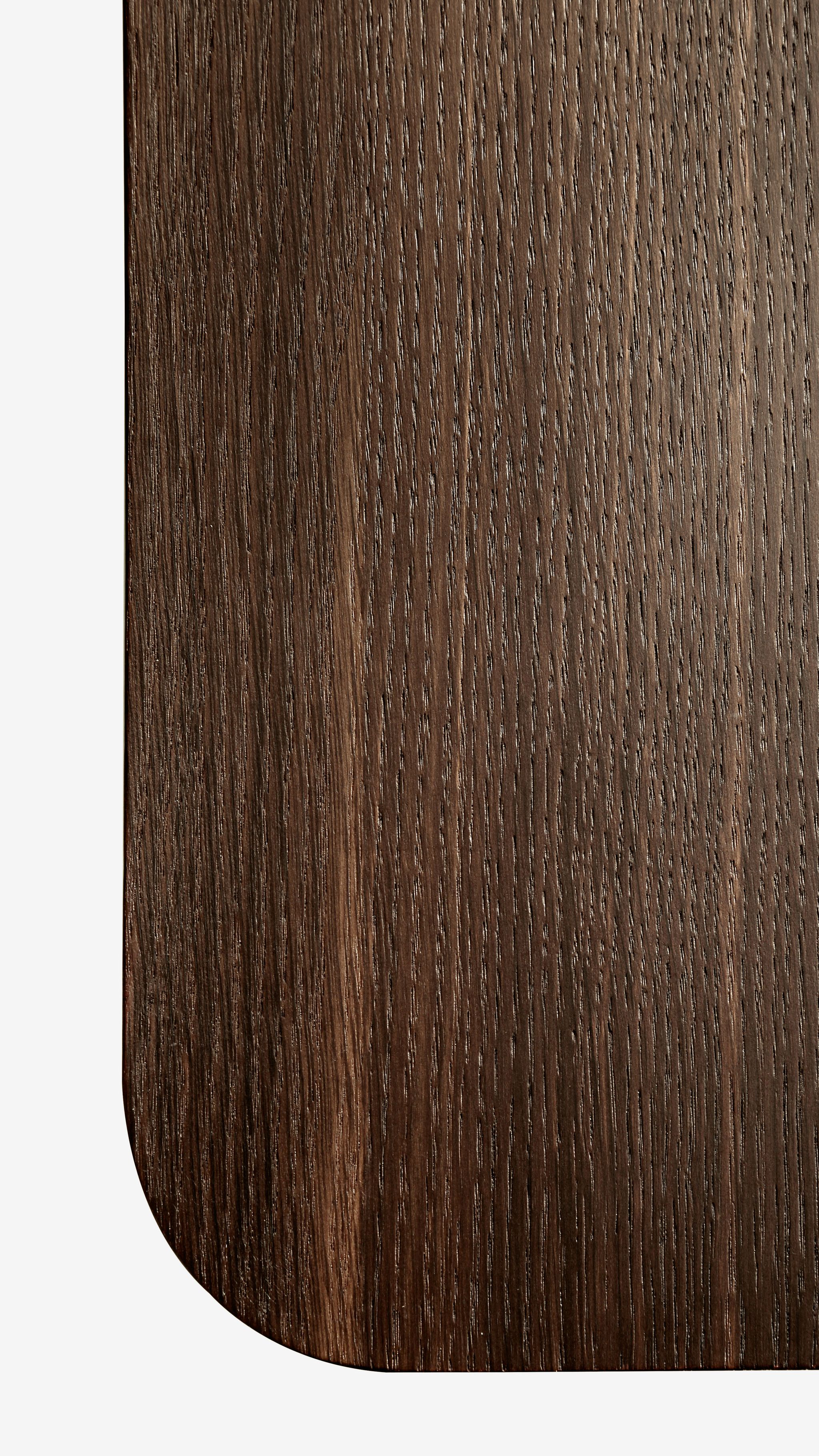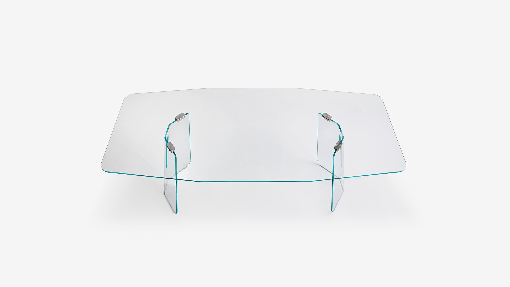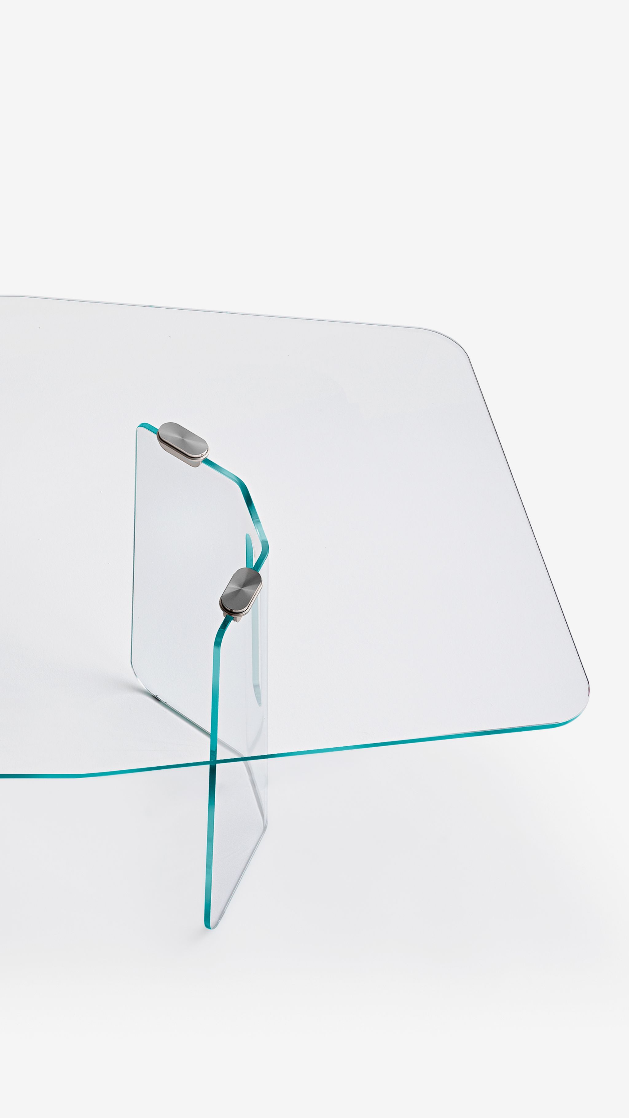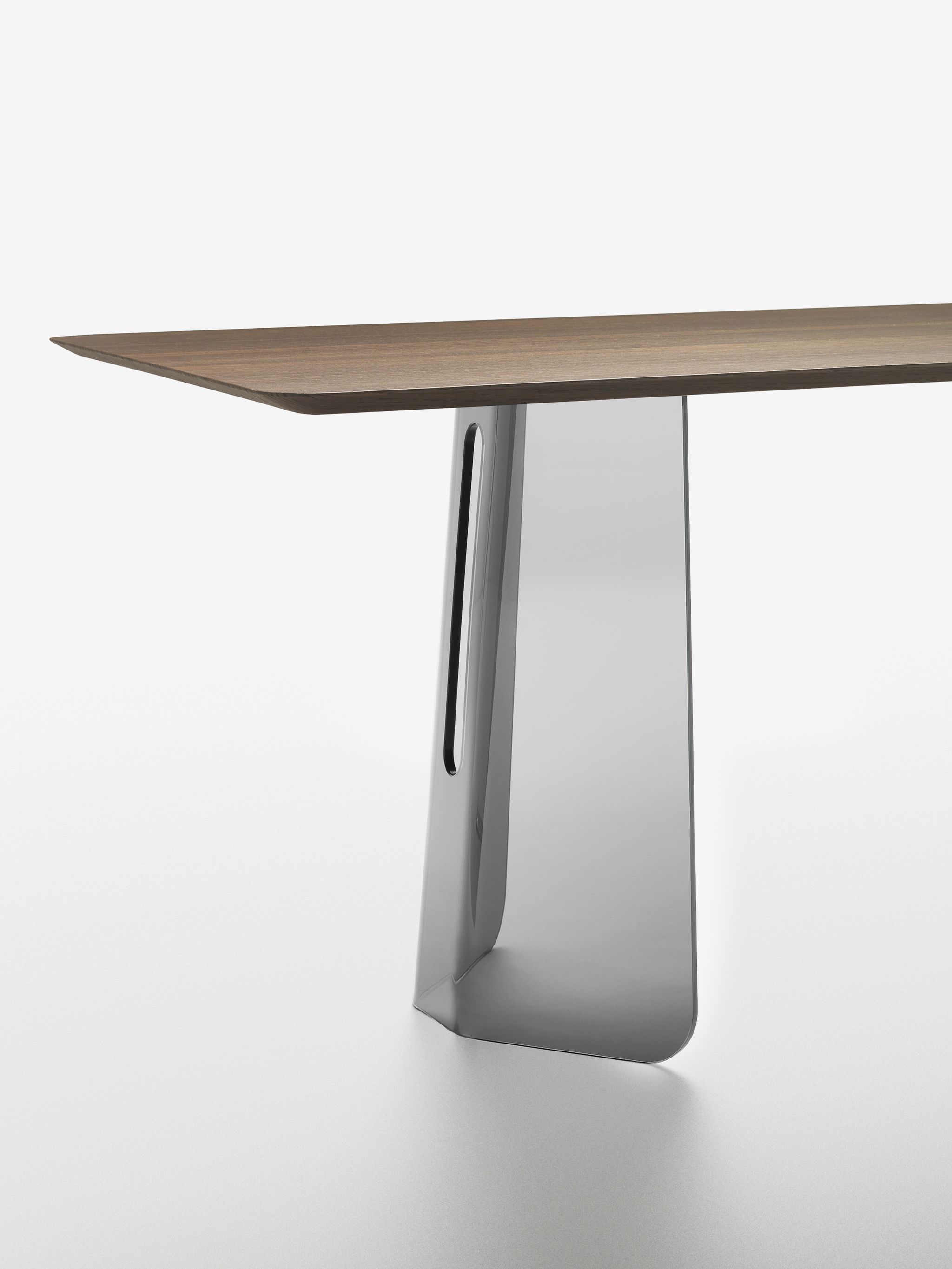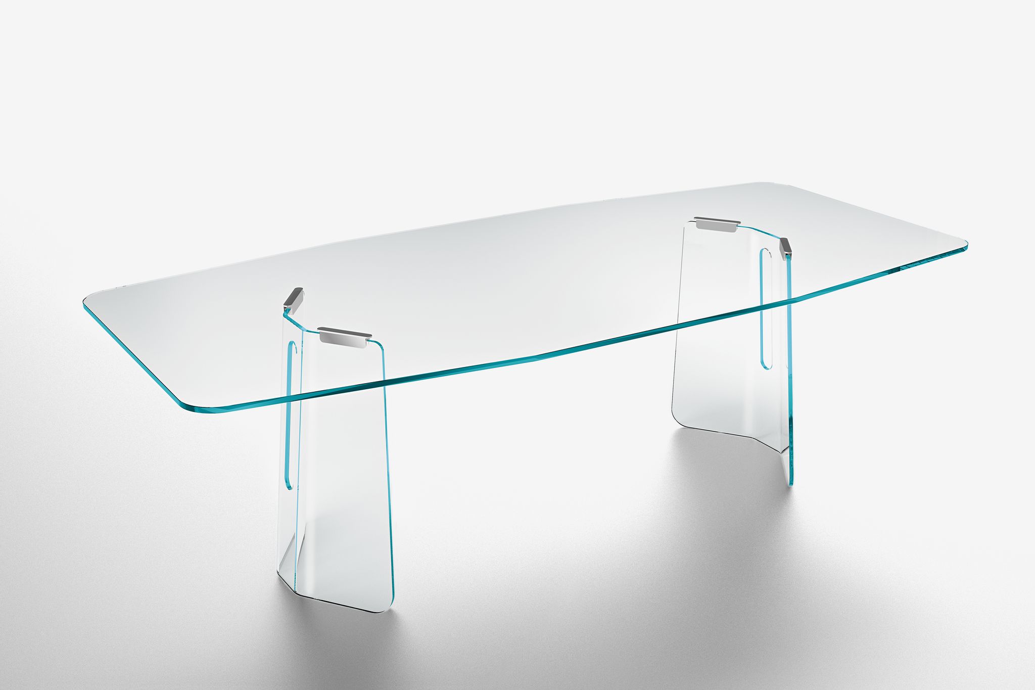 The reference to the modern Milanese architecture of the post-war period, composed by lines and shapes always characterized by a rigorous logic, wants to prove the continuous link between production techniques and new materials. Table, chairs, and chest which become part of a collection with geometric lines, inspired by the elegance and harmonious balance of the namesake classic ballet movement. Table made of two 12 mm shaped and curved glass bases with glass or oak-finished top.